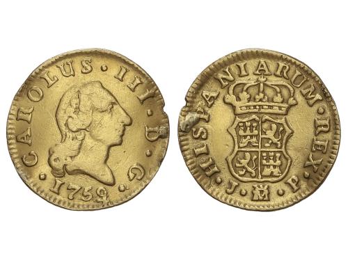 CARLOS III. 1/2 Escudo. 1759. MADRID. J.P. 1,70 grs. Cara de Rata. (Descolgada, restos de soldadura). AC-1241. BC+.