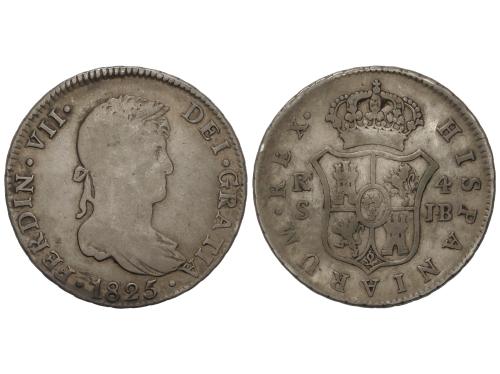 FERNANDO VII. 4 Reales. 1825. SEVILLA. J.B. 13,43 grs. Pátina. MUY RARA. AC-1132. BC+.