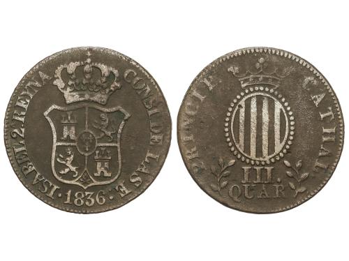 ISABEL II. 3 Cuartos. 1836. BARCELONA. 7,40 grs. Leyendas: C