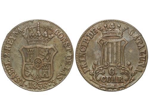 ISABEL II. 6 Cuartos. 1836. BARCELONA. 12,56 grs. Pátina. AC-15. MBC.