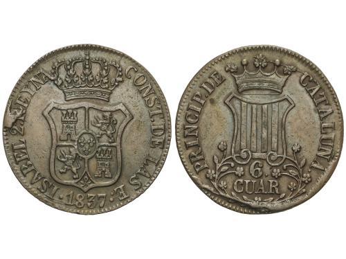 ISABEL II. 6 Cuartos. 1837. BARCELONA. 14,03 grs. Pátina. AC