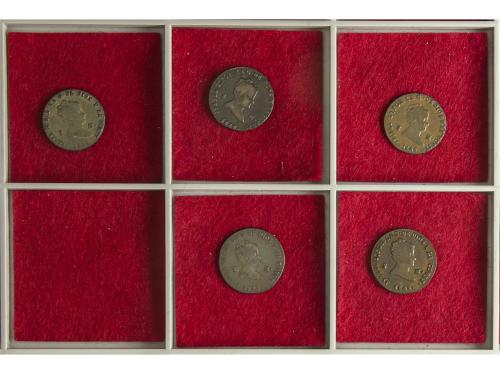ISABEL II. Lote 5 monedas 2 Maravedís. 1843, 1844, 1845, 1846 y 1849. SEGOVIA. AC-55, 56, 57, 58, 61. MBC-a EBC-.