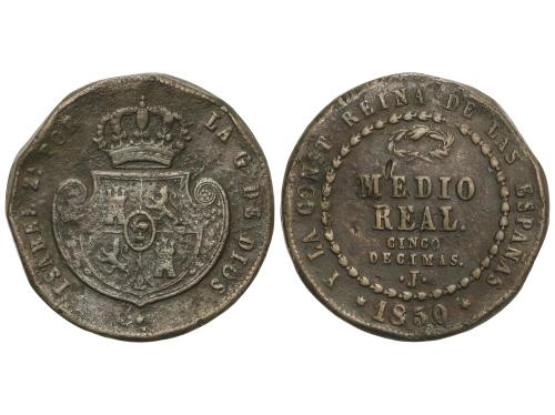 ISABEL II. 1/2 Real (5 Décimas). 1850. JUBIA. 18,34 grs. (Defectos de cospel). ESCASA. AC-149. MBC-.