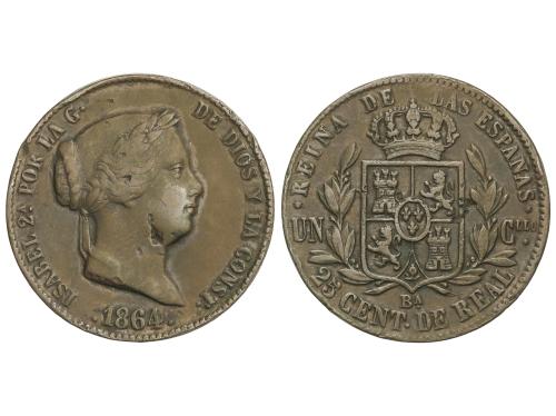 ISABEL II. 25 Céntimos de Real. 1864. BARCELONA. 9,59 grs. (