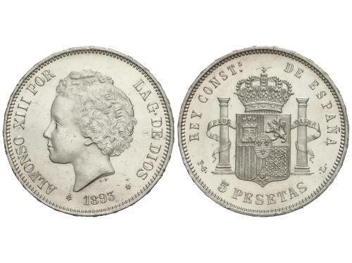 ALFONSO XIII. 5 Pesetas. 1893 (*18-93). P.G.-L. (Golpecitos y rayitas en anverso, levemente limpiada). Brillo original. EBC/EBC+.