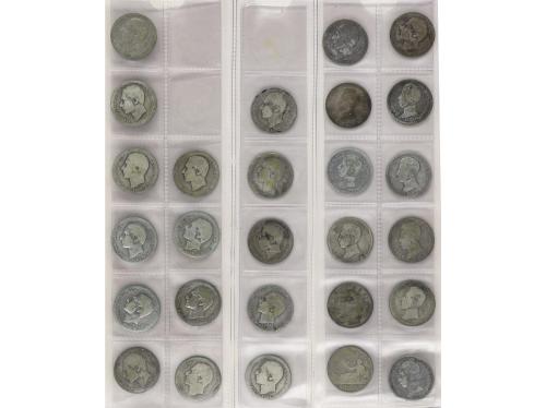 LOTES CENTENARIO. Lote 94 monedas 1 (63) y 2 Pesetas (31). 1869 a 1905. GOBIERNO PROVISIONAL a ALFONSO XIII. Calidad media baja, bastantes estrellas no visibles. A EXAMINAR. BC a MBC.