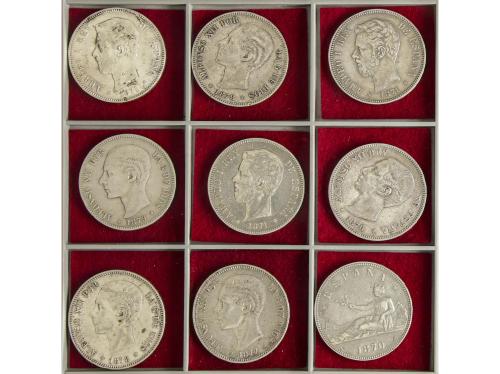 LOTES CENTENARIO. Lote 9 monedas 5 Pesetas. 1870 a 1871. GOBIERNO PROVISIONAL, AMADEO I y ALFONSO XII. 1870 (*70) y 1871 (*71, 74, 75) 1876 (*76) 1877 (*77) 1878 (*78) E.M-M. y D.E.-M y 1879 (*79). A EXAMINAR. MBC- a MBC.