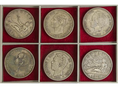 LOTES CENTENARIO. Lote 35 monedas 5 Pesetas. 1870 a 1897. GOBIERNO PROVISIONAL a ALFONSO XIII. Algunas repetidas, varias estrellas no visibles. A EXAMINAR. MBC- a MBC+.