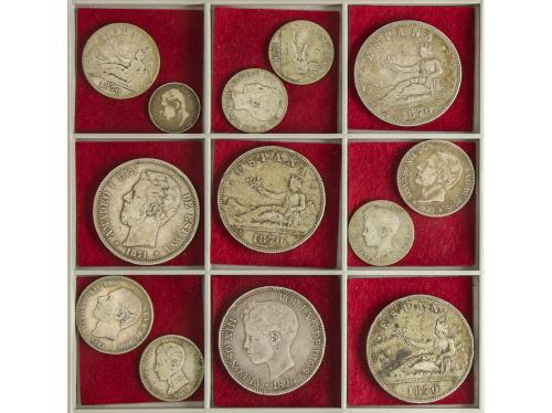 LOTES CENTENARIO. Lote 45 monedas 50 Céntimos (3), 1 (21), 2 (13), 5 Pesetas (8). 1869 a 1903. GOBIERNO PROVISIONAL a ALFONSO XIII. Peso total aprox. 425 grs. Calidad media baja. A EXAMINAR. BC a MBC+.