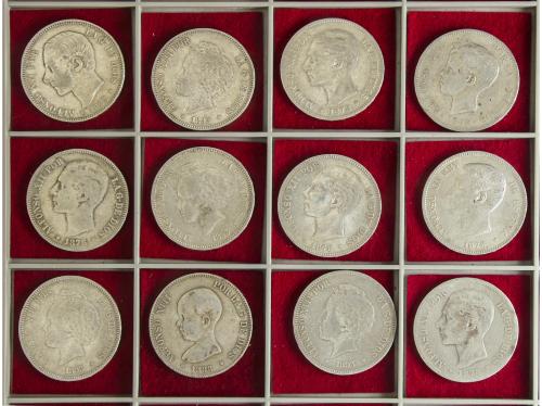 LOTES CENTENARIO. Lote 50 monedas 5 Pesetas. 1871 a 1898. AMADEO I, ALFONSO XII y ALFONSO XIII. A EXAMINAR. BC+ a MBC.