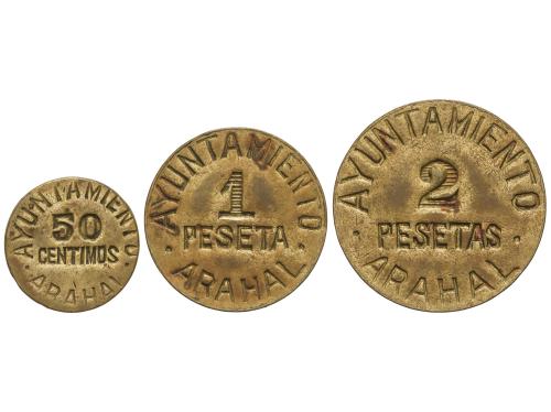 EMISIONES LOCALES GUERRA CIVIL. Serie 3 monedas 50 Céntimos, 1 y 2 Pesetas. ARAHAL. Latón. Serie completa. AC-40/42; HG-230/3. MBC+ a EBC.
