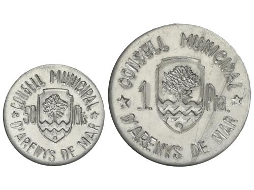 EMISIONES LOCALES GUERRA CIVIL. Serie 2 monedas 50 Cèntims y 1 Pesseta. C.M. d´ARENYS DE MAR. Al. (La de 1 Peseta pequeñas Rayitas). AC-6/7; Vti-L18/L19. SC y SC-.
