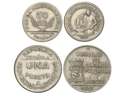 EMISIONES LOCALES GUERRA CIVIL. Lote 2 monedas 50 Céntimos y 1 Peseta. CONSEJO DE SANTANDER, PALENCIA Y BURGOS. CuNi. 50 Céntimos sin PJR. AC-33, 35. EBC-.