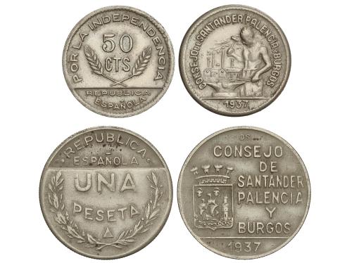 EMISIONES LOCALES GUERRA CIVIL. Lote 2 monedas 50 Céntimos y 1 Peseta. 1937. CONSEJO DE SANTANDER, PALENCIA Y BURGOS. CuNi. 50 céntimos sin PJR. AC-33, 35; HG-200, 202; Vti-L4a, L5. MBC+ y EBC-.