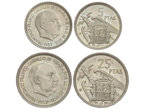 ESTADO ESPAÑOL. Lote 2 monedas 5 y 25 pesetas. 1957 (*58). C