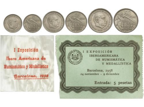 ESTADO ESPAÑOL. Serie 3 monedas 5, 25 y 50 Pesetas. 1957. (*BA). I Exposición Iberoamericana de Numismática y Medallística. Barcelona. Con sobre de celofán original y entrada. EBC+ a SC-.