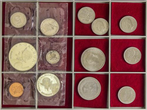 LOTES y COLECCIONES. Lote alrededor de un centenar de monedas. Siglo XX. Resto final de colección, mayoría de monedas de Estado Español, incluye carteritas de Juan carlos I y algunas monedas extranjeras. Destaca 5 monedas 5 Pesetas 1975 *80 Error del mundial. A EXAMINAR. MBC+ a SC.