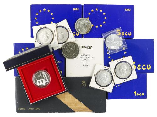 LOTES y COLECCIONES. Lote 19 monedas y 54 medallitas. 1876 a 1999. ALFONSO XII, ESTADO ESPAÑOL, JUAN CARLOS I, CANADÁ y MEDALLAS. AR. Ø  mm. Incluye: 5 Pesetas 1876, 6x 100 monedas 1966, 2.000 Pesetas 1997, 1 Dollar 1983 CANADÁ, 1 Ecu 1989 y 4x 5 Ecu 1989 a 1992 EMISIONES EN ECU (en estuche), Serie 5 monedas 100 a 2.000 Pesetas V CENTENARIO (en estuche), 1x medalla EXPO 92 SEVILLA (en estuche), 1x medalla 1999 Centenario Barça (en estuche) y 52 medallitas de pequeño tamaño y de plata (3, 75 grs cada una) en 4 series de 13 medallitas de tematica malagueña (Personajes de Málaga y 3x cofradias de Málaga, todas diferentes)en cuatro presentaciones originales. La gran mayoria Diferentes (Solo se repiten las de 100 Pesetas 1966). TODAS LAS MONEDAS Y MEDALLAS DE PLATA. IMPRESCINDIBLE EXAMINAR. MBC a SC.