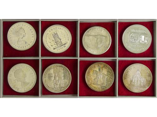 CANADÁ. Lote 15 monedas 1 (12) y 5 Dollars (3). 1958 a 1990. en total 359 grs. AR. Todas de plata, Dos repetidas. Once monedas commerativas, una tipo canoa y una onza Mapple Leaf. A EXAMINAR. EBC a PROOF.