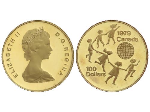 CANADÁ. 100 Dollars. 1979. ELIZABETH II. 16,91 grs. AU (917). Año del Niño. En estuche original con certificado. (Infimas rayitas). Fr-10; KM-126. PROOF.