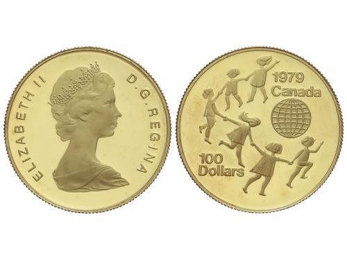 CANADÁ. 100 Dollars. 1979. ELIZABETH II. 16,87 grs. AU (917). Año del Niño. En estuche original con certificado. (Infimas rayita EN ANVERSO). Fr-10; KM-126. PROOF.