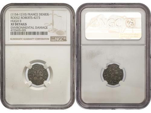 FRANCIA. Denier. 1154-1210 d.C. HUGO II. Encapsulado por Encapsulada por NGC XF DETAILS ENVIRONMENTAL DAMAGE (n. 4725605-005). AR. Roberts-4273. MBC+.