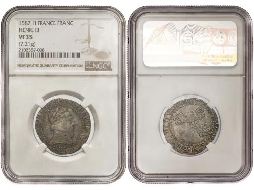 FRANCIA. 1 Franc. 1587. HENRI III. Encapsulado por Encapsulada por NGC VF 35 (n. 2102387-008). AR. Dup-1130. MBC.