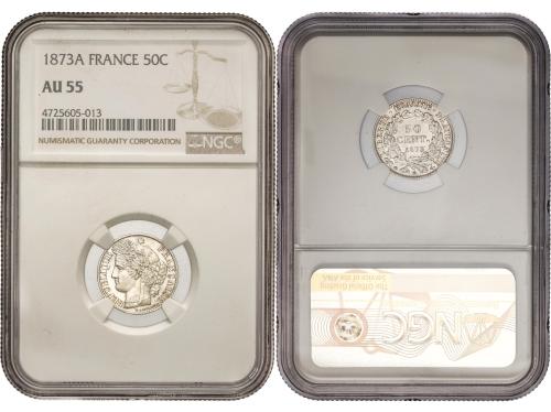 FRANCIA. 50 Centimes. 1873-A. PARIS. Encapsulado por Encapsulada por NGC AU 55 (n. 4725605-013). AR. KM-834.1. EBC.