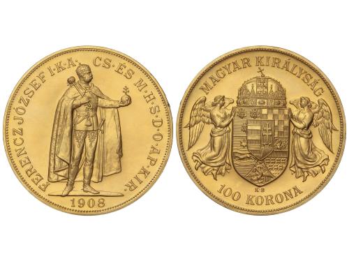 HUNGRÍA. 100 Korona. 1908-KB. FRANZ JOSEPH I. KREMNITZ. 33,85 grs. AU (900). Reacuñación oficial (Restrike). Fr-249R; KM-491. SC.