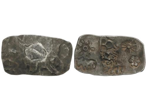 INDIA. Lingote. (321-185 a.C). DINASTIA SUNGA. IMPERIO MAURYA. 7,53 grs. AR. Ø 35 x 20 mm. Pátina. A EXAMINAR. MBC.