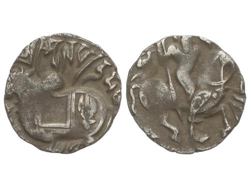 INDIA. Jital. 850-1000 d.C. SAMANTA DEVA. Anv.: Cebú reclinado a izquierda. Rev.: Jinete a derecha. 3,19 grs. AR. Pátina. EBC-.