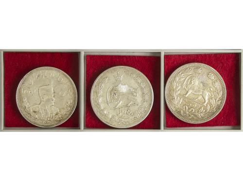 IRÁN. Lote 3 monedas 5000 Dinars (2) y 5 Rials. 1902 a 1934 (1310 a.H. a 1313 SH). AR. Diferentes. A EXAMINAR. EBC- a EBC.
