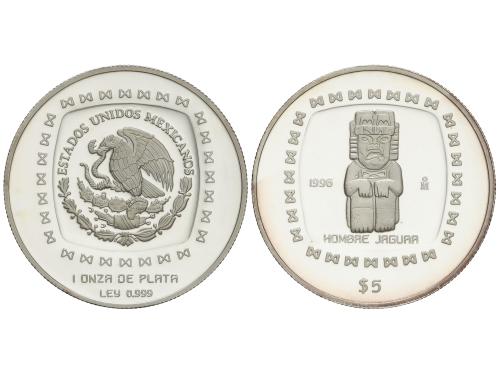 MÉXICO. 5 Pesos. 1996. 30,99 grs. AR. Hombre Jaguar. KM-596. Tirada: 4.200 piezas. PROOF.