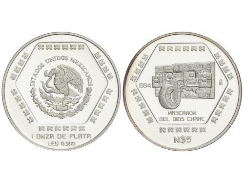 MÉXICO. 5 Nuevos Pesos. 1994. 31,24 grs. AR. Dios Chaac. KM-577. Tirada: 6.300 piezas. PROOF.