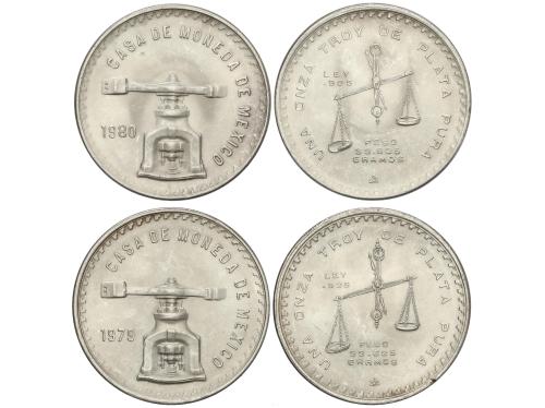 MÉXICO. Lote 2 monedas Onza Troy. 1979 y 1980. AR. Prensa. KM-M49b.4, M49b.5. EBC+ a SC-.