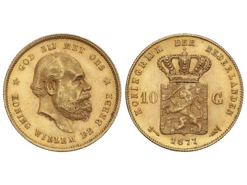 HOLANDA. 10 Gulden. 1877. WILLIAM III. 6,70 grs. AU (900). Parte de brillo original. Fr-342; KM-106. EBC.