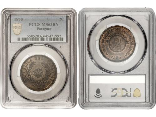 PARAGUAY. 2 Centesimos. 1870. Encapsulado por Encapsulada por PCGS MS 63 BN (n. 550520.63/45471992). AE. KM-3. SC.