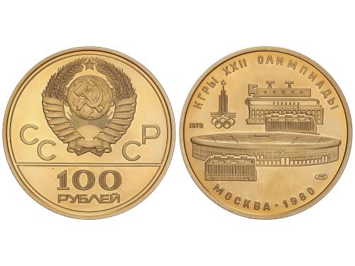 RUSIA. 100 Rublos. 1978-(m). MOSCOW. 17,35 grs. AU (900). Juegos Olímpicos Moscú´80: Estadio Lenin. Fr-187: Y-151. FDC.