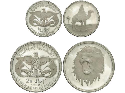 YEMEN. Lote 2 monedas 1 y 2 Riyals. 1969. AR. Qadhi memorial. Tirada máxima: 3.200 piezas. León. Tirada máxima: 4.200 piezas. KM-1, 4. PROOF.