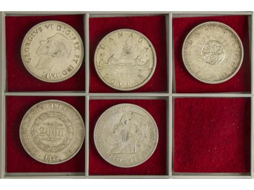 LOTES Y COLECCIONES EXTRANJERO. Lote 5 monedas. 1855 a 1965. BRASIL (2), CANADA (3). AR. BRASIL: 2.000 Reis 1855, 1889. CANADA: 1 Dollar 1939, 64, 65. MBC+ a EBC-.