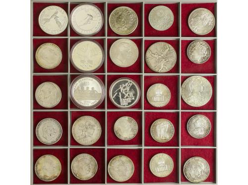 LOTES Y COLECCIONES EXTRANJERO. Lote 22 monedas y 3 medallas. 2a mitad siglo XX. ESPAÑA, FRANCIA, ESTADOS UNIDOS, RUSIA, AUSTRIA, NORUEGA, Etc. AR. Todas de plata. Incluye 6x 10 Pesetas 1966 Estado Español, 10 Roubles RUSIA 1977 Olimp. Moscú 80, 2x 1 Dollar USA 1988 y 1996 Olimpiadas, 100, 000 Lei RUMANIA 1946100 kroner 1993 NORUEGA Lillehammer 94, etc. A EXAMINAR. MBC+ a PROOF.