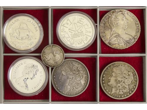 LOTES Y COLECCIONES EXTRANJERO. Lote 25 monedas y 2 medallas. 1780 (siglo XX) a 1979. AUSTRIA, ESTADOS UNIDOS, CANADÁ, GRAN BRETAÑA y ESPAÑA. AE, Ni, AR. Incluye 2x 1 Dollar USA 1880 y 1899-O, 3 sets U.S.A. (1969, 1973 y 1978), 3 monedas CANADÁ 1 Dollar en plata con estuche (1978 y 2x 1979), 1Thaler 1780 (Siglo XX) Maria Theresa AUSTRIA, 1 Peseta 1933 (*3-4), 2 pesetas 1870 (*18-73) D.E.-M. Tambien una medalla en plata Proyecto Mercurio 7 de la NASA y Medalla en Niquel del Castillo de Windsor. Algunos en sets o presesntaciones originales. Solo una repetida. IMPRESCINDIBLE EXAMINAR. MBC- a SC.