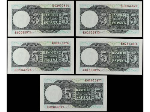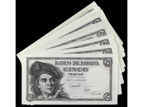 ESTADO ESPAÑOL. Lote 59 billetes 5 Pesetas. 5 Marzo 1948. Elcano. Serie E a M. Incluye un Quinteto correlativo Serie E, cuatro Crios correlativos, todos los demás parejas correlativas. (Algunas arrugas o esquinas rozadas). A EXAMINAR. Ed-455a. EBC a SC.