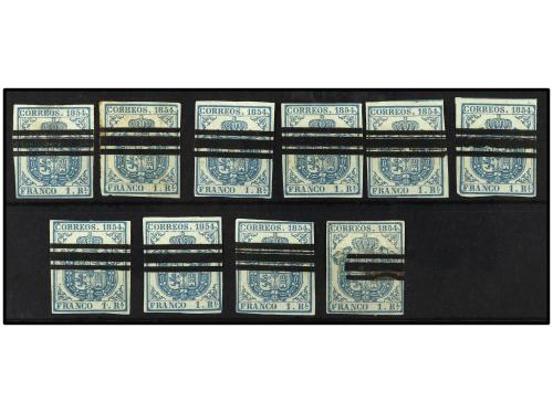 ° ESPAÑA. Ed. 34A (10). 1 real azul claro. 10 sellos BARRADOS. Cat. 1.170€.