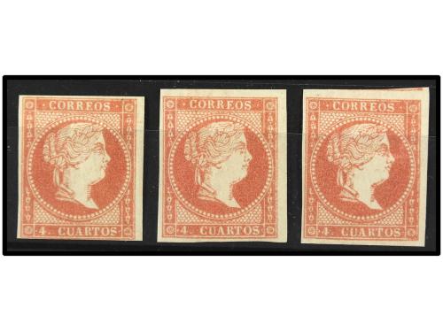 * ESPAÑA. Ed. 48B (3). 4 cuartos rojo, tipo III. 3 sellos, pliegues de goma. Cat. 285€.