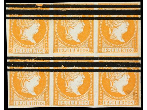 ° ESPAÑA. Ed. NE 1 (6). NO EXPENDIDOS. 12 cuartos naranja. Bloque de seis BARRADO. Cat. 900€.