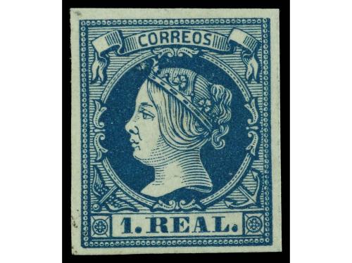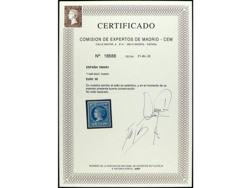 * ESPAÑA. Ed. 55. 1 real azul. Cert. CEM. Muy raro en este estado. LUJO. Cat. 385€.