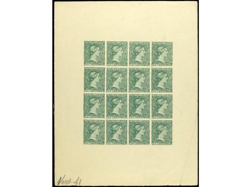 ESPAÑA. Ed. 222P. 1889. Diseño plagiado de la emisión de Alfonso XIII tipo Pelón, reproduciendo la efigie de la Regente María Cristina. 30 cts.verde (Gálvez A91) en plancha de 16 sellos. PRECIOSA. RARA.