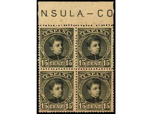 (*) ESPAÑA. Ed. 244P(4). 15 cts. negro intenso. PRUEBA en bloque de 4 con borde superior de hoja. PRECIOSA. MUY RARA.