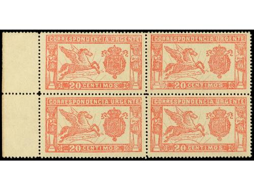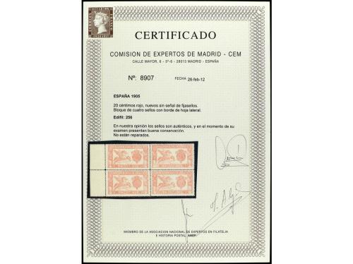 ** ESPAÑA. Ed. 256(4). 20 cts. rojo en bloque de 4. Centrado perfecto y borde lateral de hoja. Cert. CEM. MAGNIFICO. GRAN OCASION. Cat. 695€.